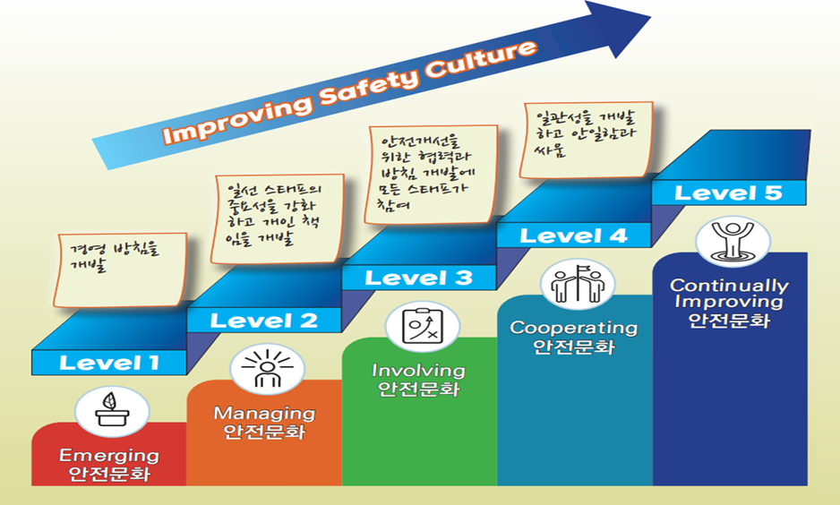 긍정적인 안전문화의 달성에서 핵심은 자체의 결과가 중요한 것이 아니라 좋은 결과를 낳기 위한 운영과정에 있습니다. 긍정적인 안전문화를 위한 노력은 경영시스템 내에서 존재하는 약점을 파악할 수 있으며, 시스템에 잠재하여 사고를 발생시킬 수 있는 중요한 것들을 이해하고 파악하는 수단을 제공할 것입니다. 안전문화를 달성하고 유지시키는 역량은 근로자들의 안전행동에 대한 경영층의 동기부여와 실행을 바탕으로 조직의 방침과 목표 달성 노력을 얼마나 지속적으로 접근하는가에 달려있습니다. 안전문화는 프로그램이 아닌 프로세스이기 때문에 지속적인 개선을 위한 노력이 필요합니다.